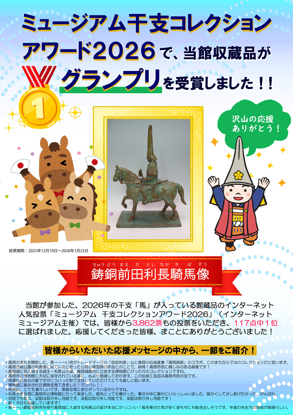 日本最大級のミュージアム情報サイト「インターネットミュージアム」のミュージアム干支コレクションアワード2026にエントリーしていた、《鋳銅前田利長騎馬像》がグランプリを獲得しました!(117点中) 《投票結果発表》ページ皆さまのおかげで、3,862票もの投票をいただきました。応援してくださった皆さまをはじめ、主催者さま、他の参加館の皆さまにも心よりお礼を申し上げます。