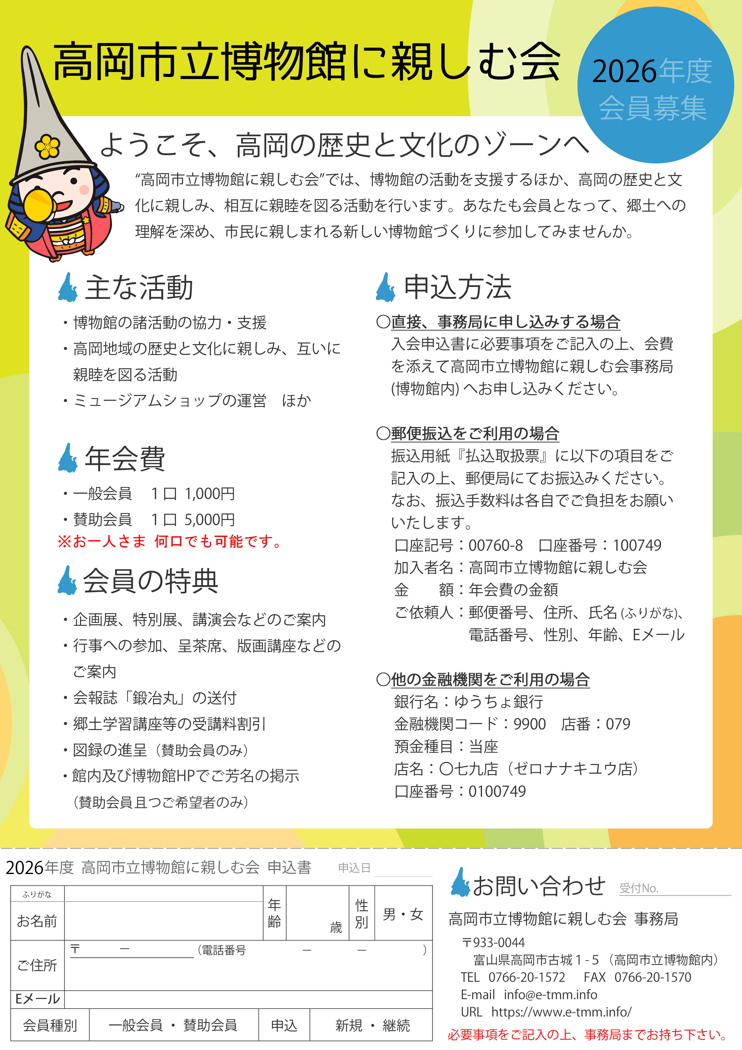 高岡市立博物館に親しむ会●2025(令和7)年度「高岡市立博物館に親しむ会」の行事予定はこちら 「高岡市立博物館に親しむ会」では、博物館の活動を支援するほか、高岡の歴史と文化に親しみ、相互に親睦を図る活動を行います。 あなたも会員となって、郷土への理解を深め、市民に親しまれる新しい博物館づくりに参加してみませんか? 〇主な活動 ・博物館の諸活動の協力、支援 ・高岡地域の歴史と文化に親しみ、互いに親睦を図る活動 ・ミュージアムショップの運営 ほか 【各種部会員募集中!】 1.研修部会…事業企画、歩く博物館等サポート 2.広報部会…会報誌「鍛冶丸」の作成 3.ワークショップ部会…呈茶席運営・サポート ★ボランティアも募集しています! 博物館事業・親しむ会事業の各種イベントの駐車場誘導や受付などを手伝っていただけるボランティアを募集しています。 〈ボランティアの主な内容〉 ・総会、呈茶席事業、歩く博物館事業、屋上開放、郷土学習講座などの受付等。 ・各種イベントなどの駐車場誘導。 ●ボランティアのお申し込みは博物館事務所にて随時受け付しております。 〇年会費 ・一般会員 一口 1,000円 ・賛助会員 一口 5,000円 ※お一人様何口でも可。賛助は団体も可。 〇会員の特典 ・企画展、特別展、講演会などのご案内 ・「歩く博物館」、呈茶席などのイベント・行事案内 ・会報誌「鍛冶丸」の送付 ・郷土学習講座・古文書講座等の受講料割引 ・博物館オリジナルクリアファイルの進呈(1回限り) 〔2025(令和7)年度は〔絵葉書「高岡古城公園」(1908〜17年、当館蔵)〕 ・図録の進呈(賛助会員のみ) ・博物館オリジナルトートバッグの進呈(賛助会員のみ。1回限り) ◎館内及び以下にご芳名を掲載させて頂きます(賛助会員且つご希望者のみ)。 【2025(令和7)年度 親しむ会 賛助会員御芳名一覧】(随時更新いたします) 〇申込み方法 入会申込書(チラシ)こちらです! ・入会申込書に必要事項を記入のうえ、会費を添えて「高岡市立博物館に親しむ会」事務局(博物館事務所)へお申込みください。 ・郵便振替をご利用の場合は、振替用紙(払込取扱票)の以下の項目をご記入のうえ、郵便局にてお振替ください。なお、振替手数料は各自でご負担いただきますよう、よろしくお願い申し上げます(博物館では所定の払込取扱票を配布しております)。 ・口座記号:00760−8 ・口座番号:100749 ・加入者名:高岡市立博物館に親しむ会 ・金額:年会費の金額 ・ご依頼人:郵便番号、住所、氏名(ふりがな)、電話番号、性別、年齢 【他の金融機関からのお振込みの場合】 銀行名:ゆうちょ銀行 金融機関コード:9900 店番:079 預金種目:当座 店名:〇七九店(ゼロナナキユウ店) 口座番号:0100749 ・こちらから振り込まれた場合、下記のお申込みチラシの「申込書」の郵便番号、住所、氏名(ふりがな)、電話番号、性別、年齢、会員種別(一般/賛助)、申込(新規/継続)をご記入され、ファックス(0766-20-1570)をしていただくか、電子メール(info@e-tmm.info)でお伝えください。 入会申込書(チラシ)こちらです! ●会報誌「鍛冶丸」を公開しています! ・創刊号(2013.11.01発行) ・第2号(2014.07.01発行) ・第3号(2015.03.01発行) ・第4号(2015.10.01発行) ※第4号の内容について、以下の通り訂正いたします。 ◆2ページ本文4行目「国指定文化財は、瑞龍寺・勝興寺・武田家・菅野家・氣多神社・佐伯家、国登録有形文化財に棚田家、市指定文化財に秋元家などの文化財、…」 ◆2ページ本文7行目「日本で二番目に、世界で最も美しい湾クラブに加盟され、…」 ・第5号(2016.06.01発行) ・第6号(2016.10.01発行) ・第7号(2017.03.01発行) ・第8号(2017.07.01発行) ・第9号(2018.03.01発行) ・第10号(2018.09.01発行) ・第11号(2019.03.01発行) ・第12号(2019.09.01発行) ・第13号(2020.03.01発行) ・第14号(2021.03.01発行) ・第15号(2022.03.01発行) ・第16号(2023.03.15発行) ・第17号(2024.03.15発行) ・第18号(2025.03.15発行) ●「高岡市立博物館に親しむ会」の過去の行事 ・平成25(2013)年度はこちら ・平成26(2014)年度はこちら ・平成27(2015)年度はこちら ・平成28(2016)年度はこちら ・平成29(2017)年度はこちら ・平成30(2018)年度はこちら ・平成31/令和元(2019)年度はこちら ・令和2(2020)年度はこちら ・令和3(2021)年度はこちら ・令和4(2022)年度はこちら ・令和5(2023)年度はこちら ・令和6(2024)年度はこちら 〇「高岡市立博物館に親しむ会」事務局 〒933-0044 富山県高岡市古城1番5号 高岡市立博物館 TEL 0766-20-1572 FAX 0766-20-1570 E-mail info@e-tmm.info このホームページ内の内容、画像の二次利用は固くお断りします。 原本作成日:2013年3月28日;更新日:2025年12月25日 |